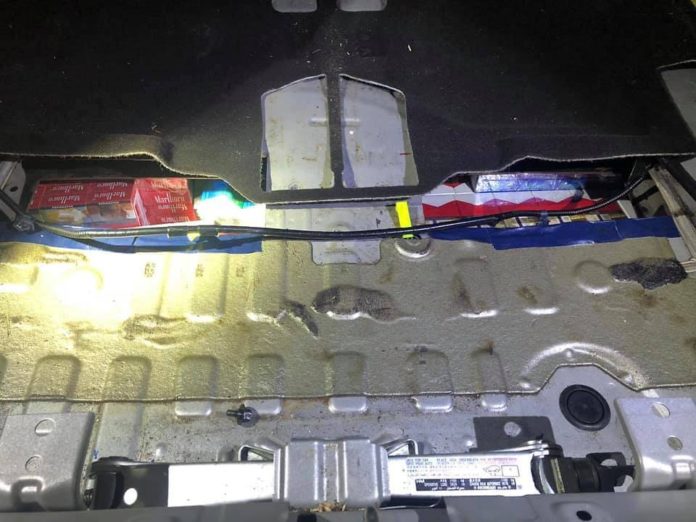 The contraband cigarettes were found concealed within the vehicle’s modified fuel tank and a modified compartment at rear of the car.