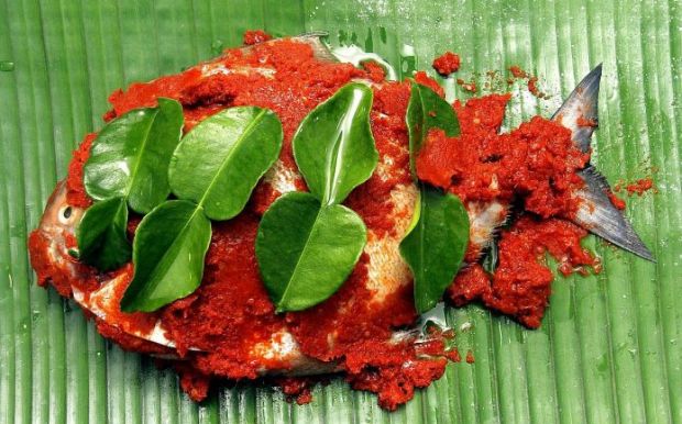 13. Place the fish on the banana leaves. Stuff the fish with the fried spice paste. Drizzle the coconut oil over both sides of the fish. (C)
