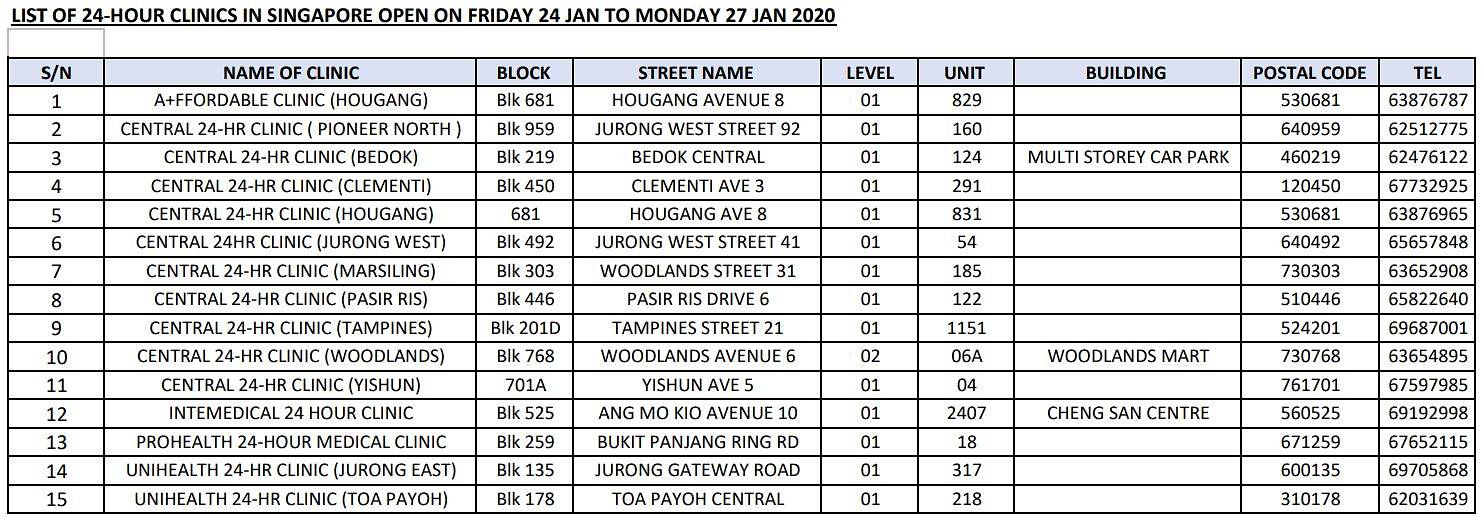 A complete list of the clinics with their operating hours can be found on the MOH website. They include 15 24-hour clinics spread across the island.