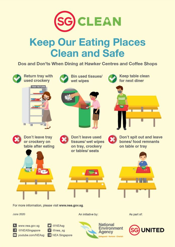 These include returning trays and used crockery, as well as disposing of used tissues or wipes in rubbish bins. Diners should not leave used tissue paper on trays or on tables or seats, said NEA.