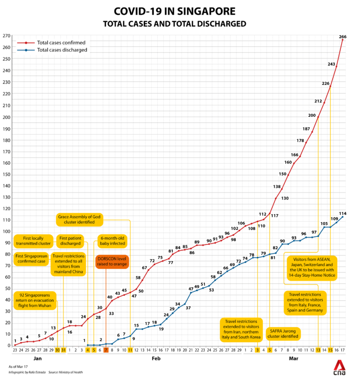 SINGAPORE: The Ministry of Health (MOH) reported 23 more cases of COVID-19 infection on Tuesday (Mar 17), bringing Singapore’s total to 266.