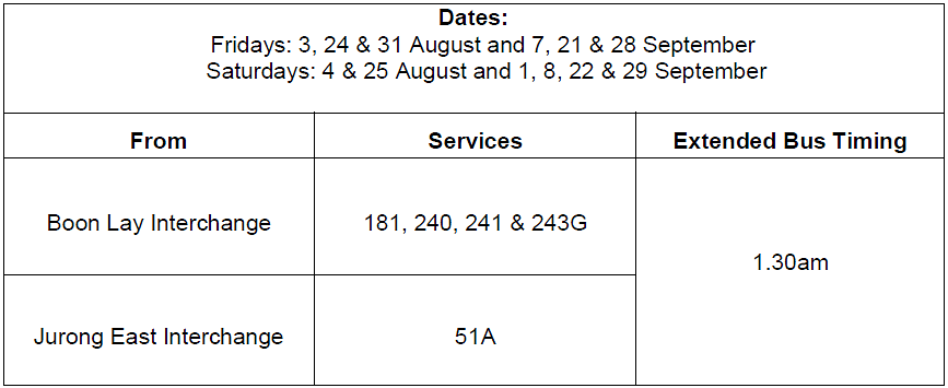 SBS Transit said in a news release on Monday (Jul 30) that operating hours for bus services 181, 240, 241, 243G and 51A will be extended to 1.30am on selected Fridays and Saturdays in the two months.